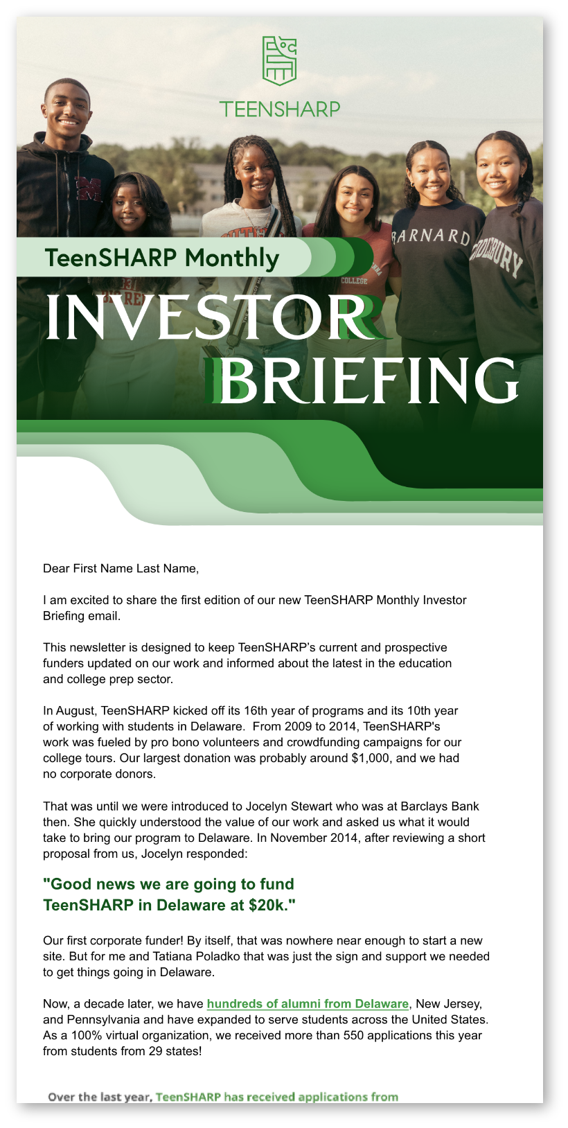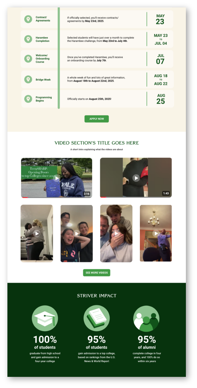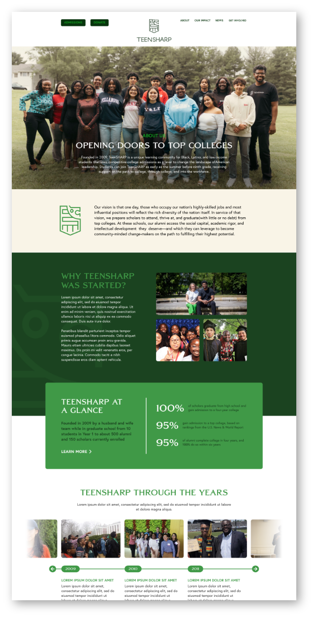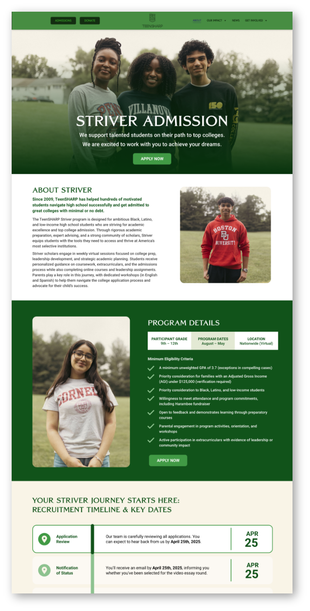 We started working with TeenSHARP at a pivotal moment in their journey. After 15 years of helping thousands of high-achieving Black, Latino, and low-income students navigate high school successfully and get admitted to America's most selective colleges with minimal or no debt, the non-profit had a bold vision to expand their mission nationwide.